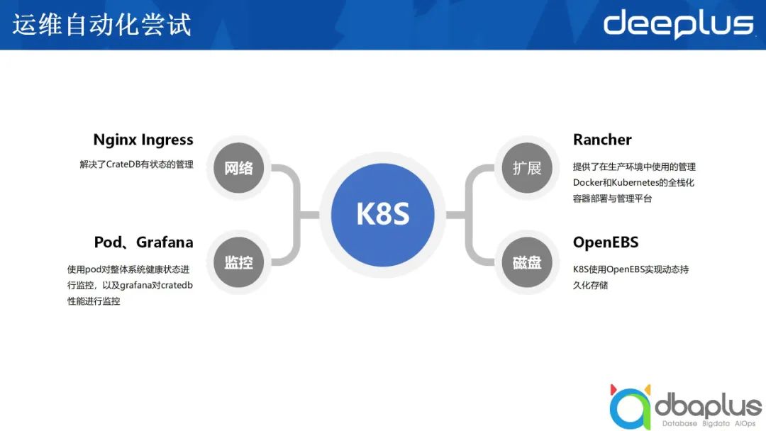 我当时是用 Rancher、OpenEBS,以及Nginx Ingress实现了一个在K8S上的CrateDB集群,这使得我们在云环境去部署CrateDB成为一种可能,部署到云上,即便是私有云上,也可以提高硬件使用率,这也是我的初衷。