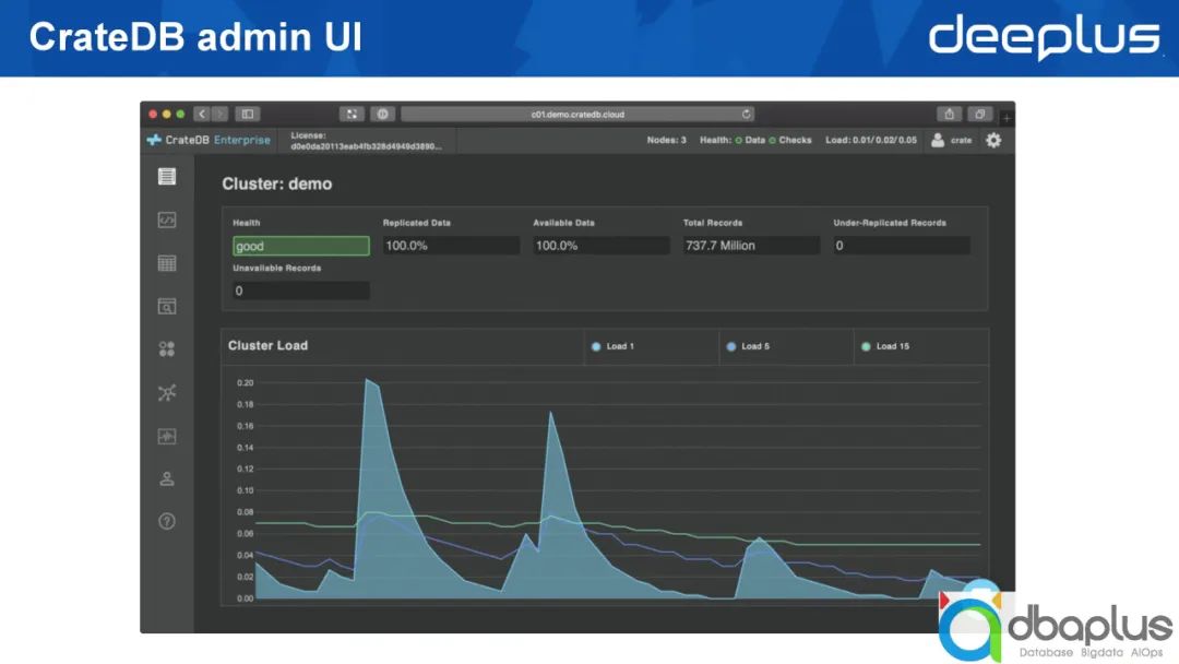 CrateDB安装完成后,会打开上图所示的操作界面,我们能够直接写入查询语句,也可以方便地观测到整个集群的状况。