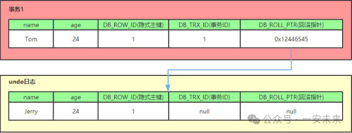 每一次记录变更之前都会先存储一份快照到undo log中,那么这几个隐式字段也会跟着记录一起保存在undo log中,就这样,每一个快照中都有一个db_trx_id字段表示了对这个记录做了最新一次修改的事务的ID ,以及一个db_roll_ptr字段指向了上一个快照的地址。(db_trx_id和db_roll_ptr是重点,后面还会用到)