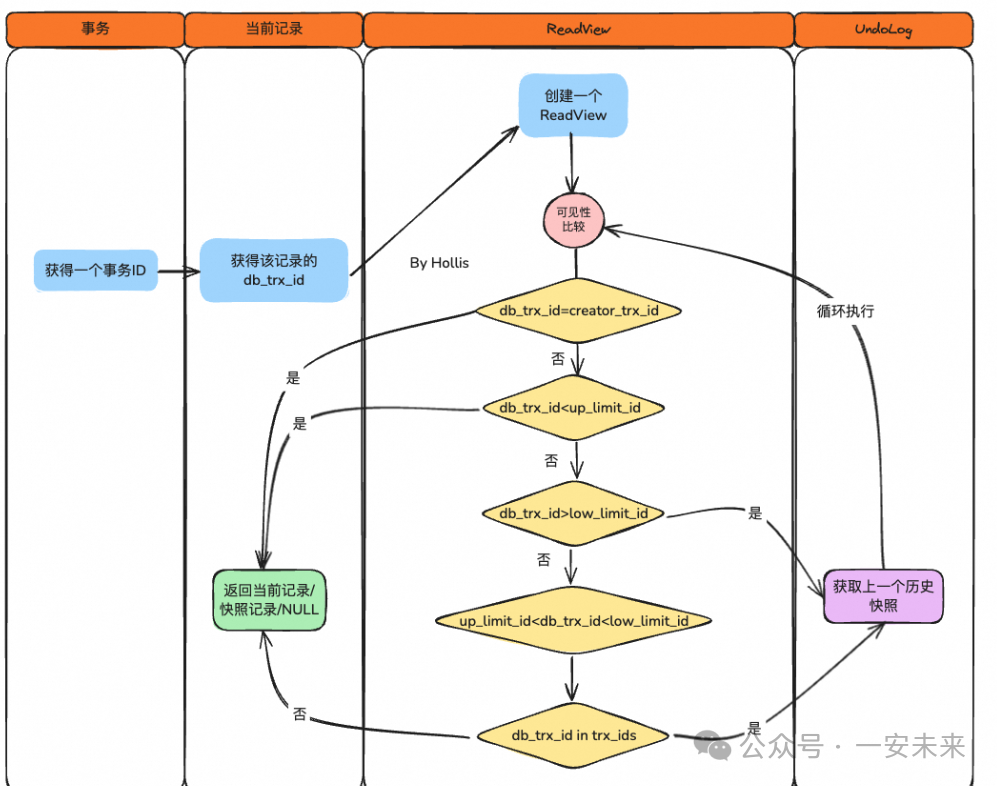 trx_ids,表示在生成Read View时当前系统中活跃的读写事务的事务id列表。low_limit_id,应该分配给下一个事务的id值。up_limit_id,未提交的事务中最小的事务ID。creator_trx_id,创建这个Read View的事务ID。Read View遵循一个可见性算法,主要是将要被修改的数据的最新记录中的DB_TRX_ID(即当前事务ID )取出来,与系统当前其他活跃事务的ID去对比(由Read View 维护),如果DB_TRX_ID跟Read View的属性做了某些比较,不符合可见性,那就通过DB_ROLL_PTR回滚指针去取出Undo Log中的DB_TRX_ID再比较,即遍历链表的DB_TRX_ID(从链首到链尾,即从最近的一次修改查起),直到找到满足特定条件的DB_TRX_ID,那么这个DB_TRX_ID所在的旧记录就是当前事务能看见的最新老版本。