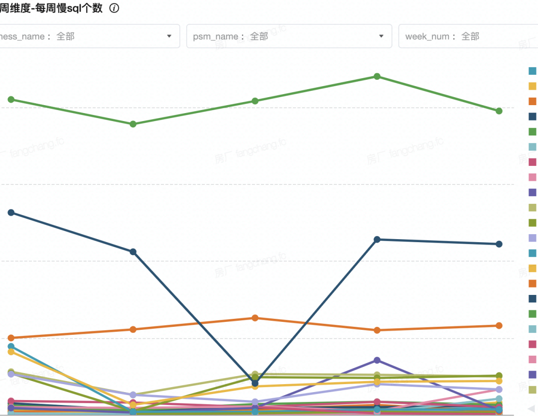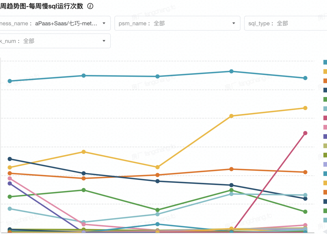 以字节 RDS 平台数据库的慢 SQL 数据为依据,量化管理客增每日/每周/每月的慢 SQL 数量&运行次数。按照度量看板数据推动大家及时改进存量的慢 SQL,降低数据库质量风险。例如周维度的运行次数 & 慢 SQL 条数趋势图如下所示: