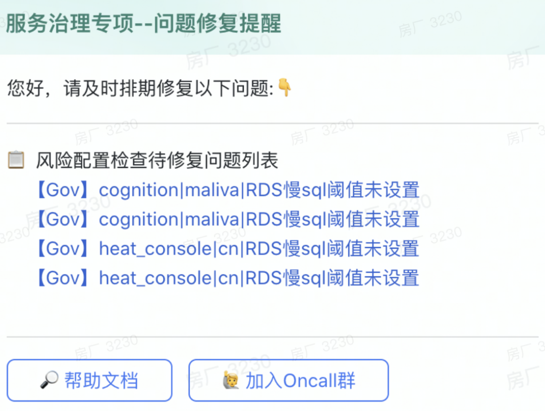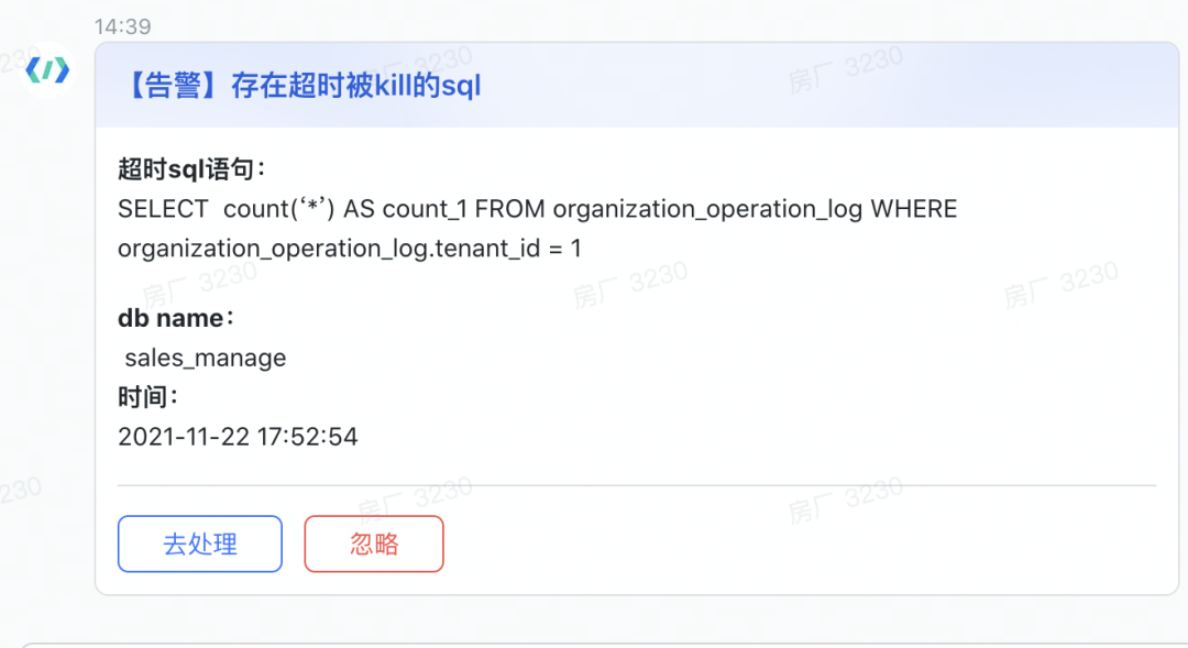 配置 db 慢查询阈值后,如果超过该阈值则该语句会被 db 自动 kill,订阅后会自动将获取到的 kill 信息发送到对应群中