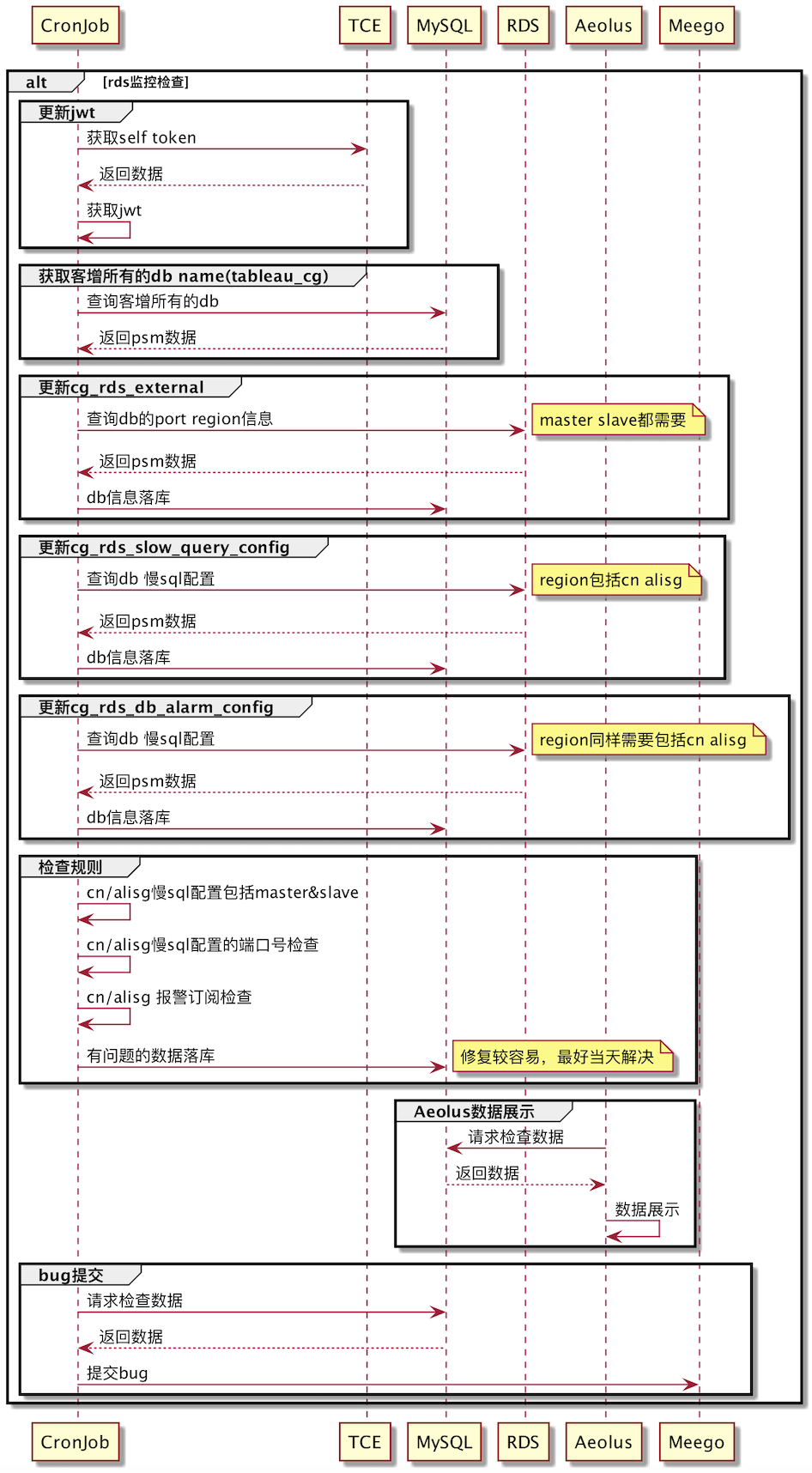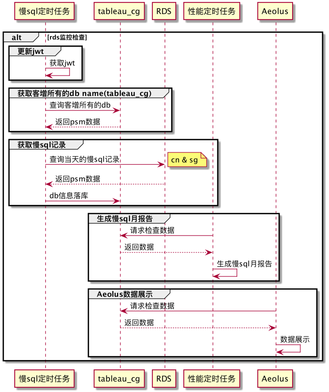 当 SQL 执行时间超过该阈值后,会被自动 kill 终止运行,相当于慢 SQL 的容灾配置(如果一条 SQL 执行了 3 个月还在运行,结果不敢想象)慢 SQL 阈值配置自动化管理是解决业务关联的数据库全部配置了慢 SQL 阈值信息。该部分通过线上定时巡检来实现,流程如下: