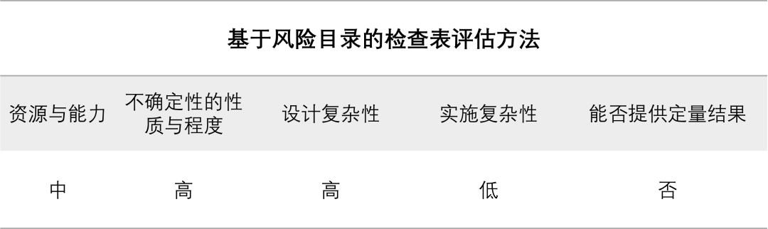 基于风险目录的检查表评估方法需要在专家的指导下建立目录列表,设计比较复杂,但是在实施阶段只需要根据列表逐条检查即可,因此执行起来较为简单。
